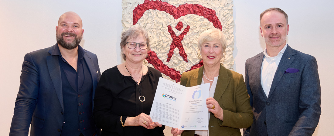 Illingen | Per la terza volta consecutive, l'azienda di vendita diretta proWIN Winter GmbH ha completato con successo il processo di ricertificazione "Azienda a misura di famiglia", confermando così il relativo sigillo di qualità per altri tre anni. Frank Thomé, CEO della Camera di Commercio e Industria (IHK), e Ute Knerr, rappresentante di Saaris, hanno consegnato ufficialmente il certificato il 9 dicembre 2025 presso la sede centrale di proWIN a Gabi Winter, membro del comitato direttivo di proWIN, e Michael Winter, amministratore delegato di proWIN, che hanno entrambi sottolineato il loro impegno su questi temi.