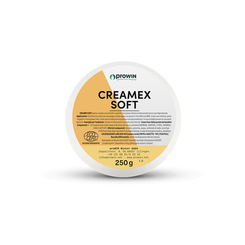CREAMEX SOFT scioglie anche lo sporco più ostinato e garantisce protezione delle superfici e una brillantezza radiosa con cera d'api naturale e sapone a base di olio di cocco. La pasta detergente è molto economica ed è adatta a tutte le superfici lisce e dure in metallo, plastica e vetro. La facile applicazione unisce perfetta pulizia e cura in un unico passaggio.