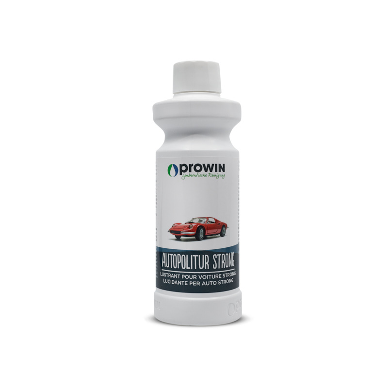 proWIN LUCIDANTE PER AUTO STRONG con abrasivi speciali rimuove i residui di sporco e leggere macchie di catrame da vernici colorate e metallizzate opache e fortemente alterate. I graffi sottili e le aree opache della superficie della vernice vengono levigati e la vernice riacquista la lucentezza e il colore originali. Perfetto in combinazione con proWIN CERA DURA PER AUTO per la successiva conservazione della vernice - la finitura perfetta per la protezione contro gli agenti atmosferici.